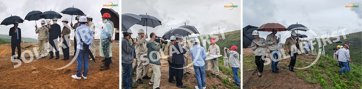 On June 14, 2022, a delegation of leaders from China Hydropower Ninth Engineering Bureau Co., Ltd. and the Yunnan Branch of China Datang Corporation visited the construction site of the 60MW photovoltaic power station project located in Dali Prefecture, Yunnan Province. Zhang Shaofeng, the deputy general manager of Solar First Group, accompanied the inspection.