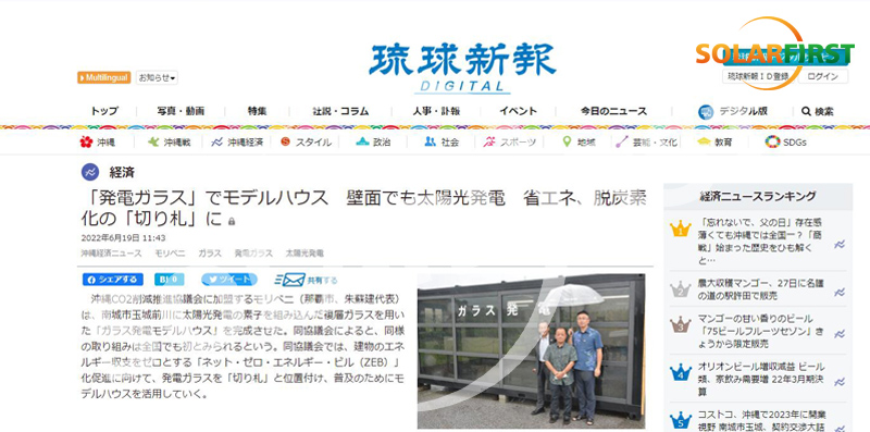 • According to the Ryukyu Shinpo of Japan, the Ryukyu Carbon Dioxide Reduction Promotion Association regards Solar First's solar glass products as the "ace" for promoting "zero energy buildings".