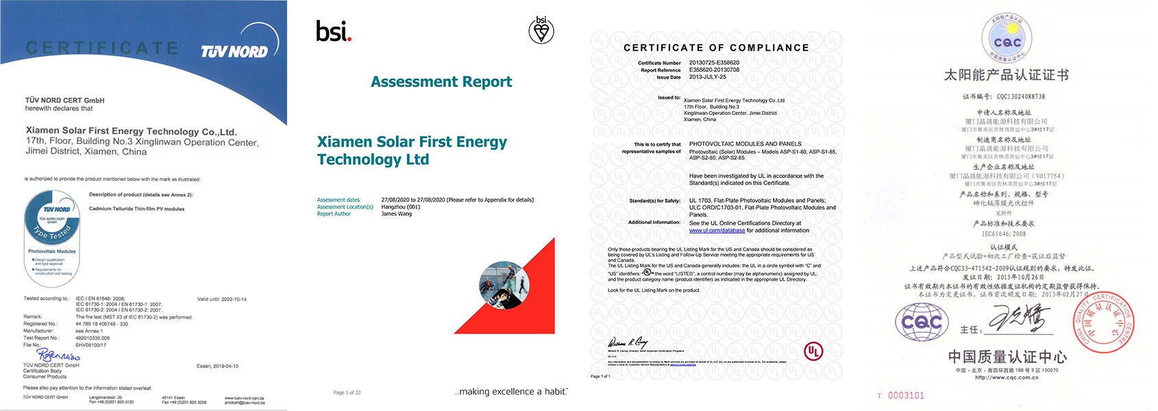 The cadmium telluride (CdTe) photovoltaic glass of Solar First has been certified by globally renowned institutions such as TUV SUD (TUV), British Standards Institution (BSI), and Micro Power Generation Product Certification Scheme (MCS).