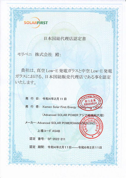 On February 11, 2022, Solar First signed an exclusive agency agreement with the renowned Japanese company モリベニ 株式会社, authorizing it as the general agent of the company in Japan.