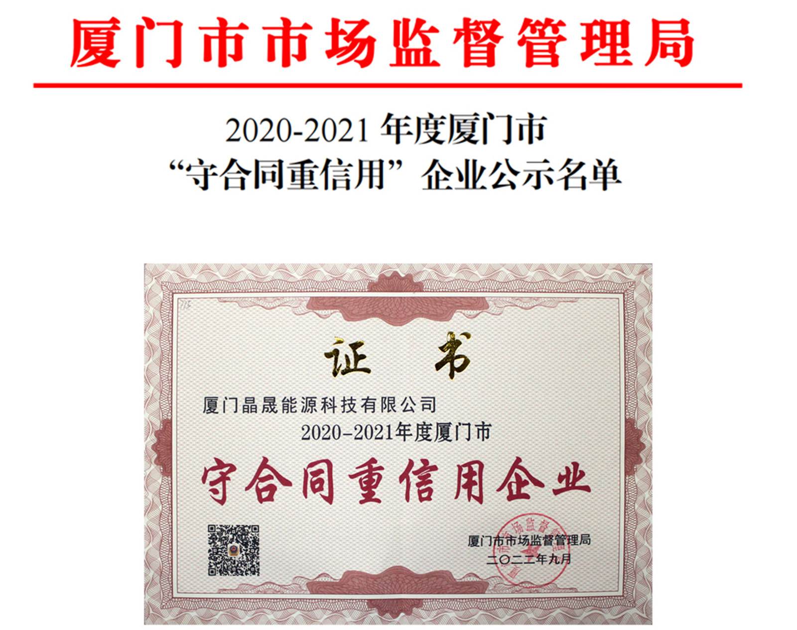 Solar First Group has been awarded the 2020-2021 "Contract-Honoring and Credit-Honoring Enterprise" certificate by the Xiamen Market Supervision and Administration Bureau. This prestigious recognition follows closely on the company's recent National High-Tech Enterprise certification.