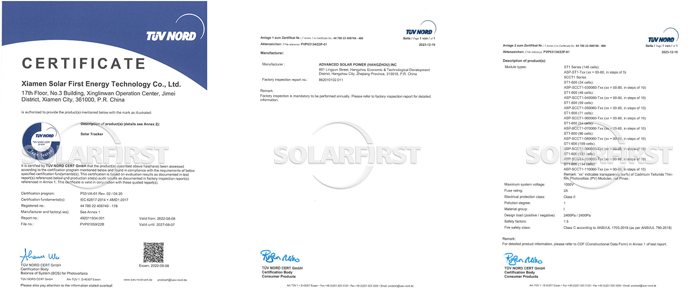 In early August 2022, Solar First Group's independently developed Horizon S-1V and Horizon D-2V tracking systems successfully completed certification testing by TÜV North Germany, securing the IEC 62817 certificate. This milestone advances Solar First's tracking products into international markets while validating their stability and reliability through authoritative global recognition.