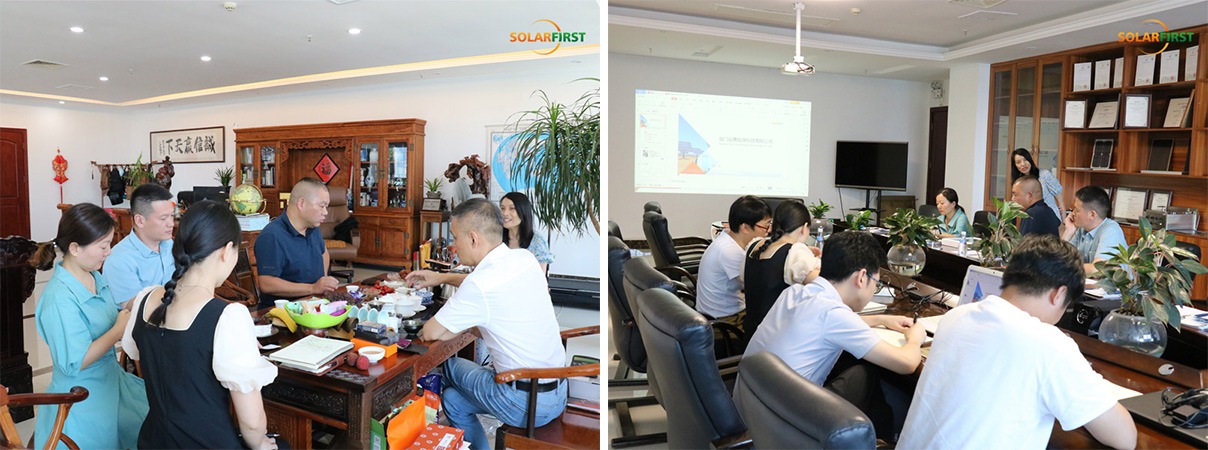 On July 21, 2022, Xinyi Glass Engineering (Dongguan) Co., Ltd. ("Xinyi Glass") executives visited Solar First Group. The delegation comprised Vice President Liao Jianghong, Deputy General Manager Li Zixuan, and Sales Manager Zhou Zhenghua. They were hosted by Solar First Group President Ye Songping and Managing Director Zhou Ping to discuss collaborative support for Building Integrated Photovoltaic (BIPV) product R&D.