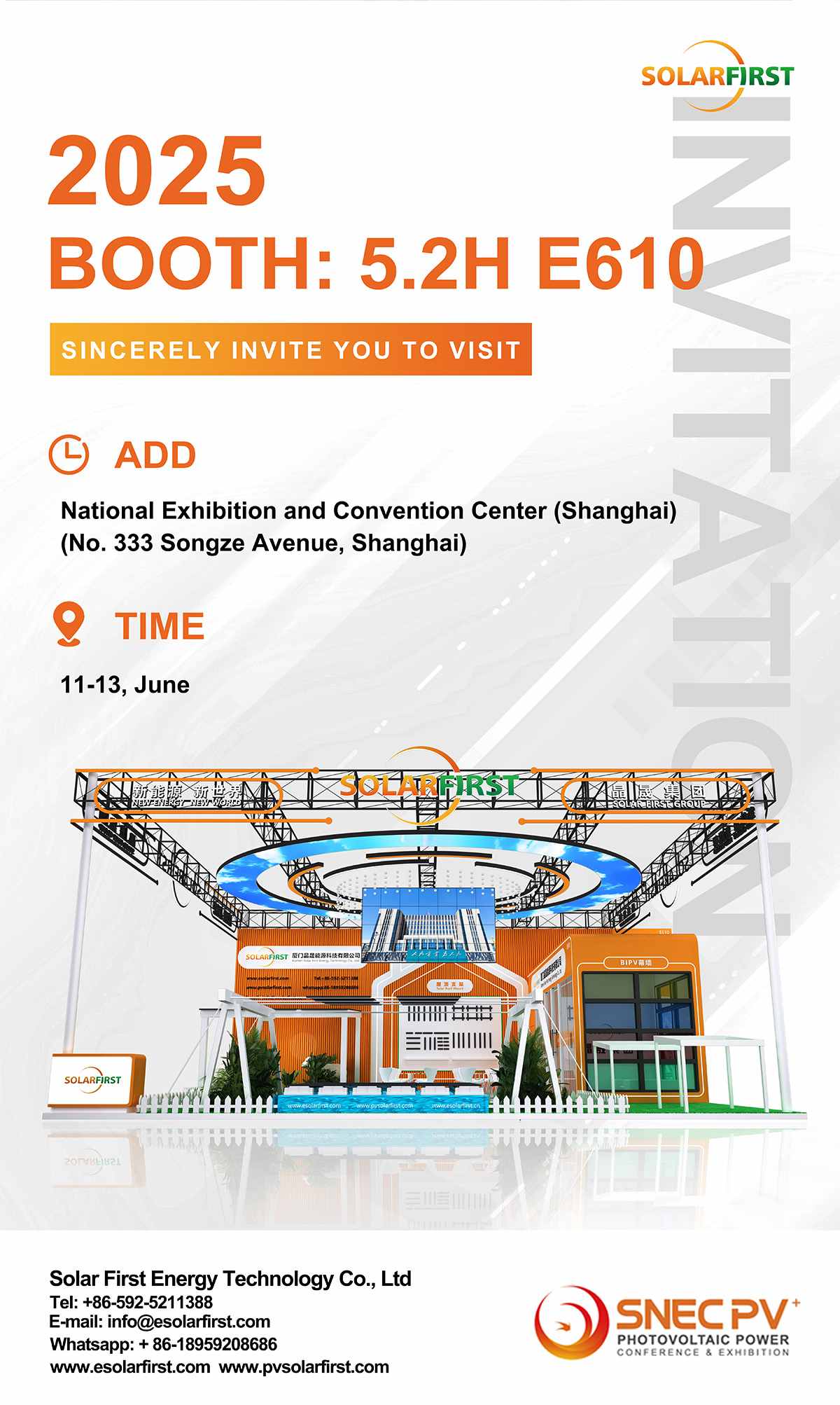 Solar First Group cordially welcomes you to the 18th SNEC International Solar Photovoltaic and Smart Energy Conference (Shanghai), June 11-13, 2025 at Shanghai National Convention Center. Visit us at Booth 5.2H-E610 to examine advanced clean energy solutions and discuss sustainable development collaborations.