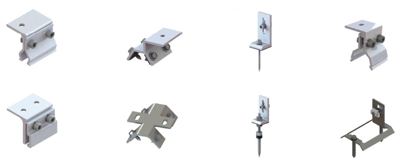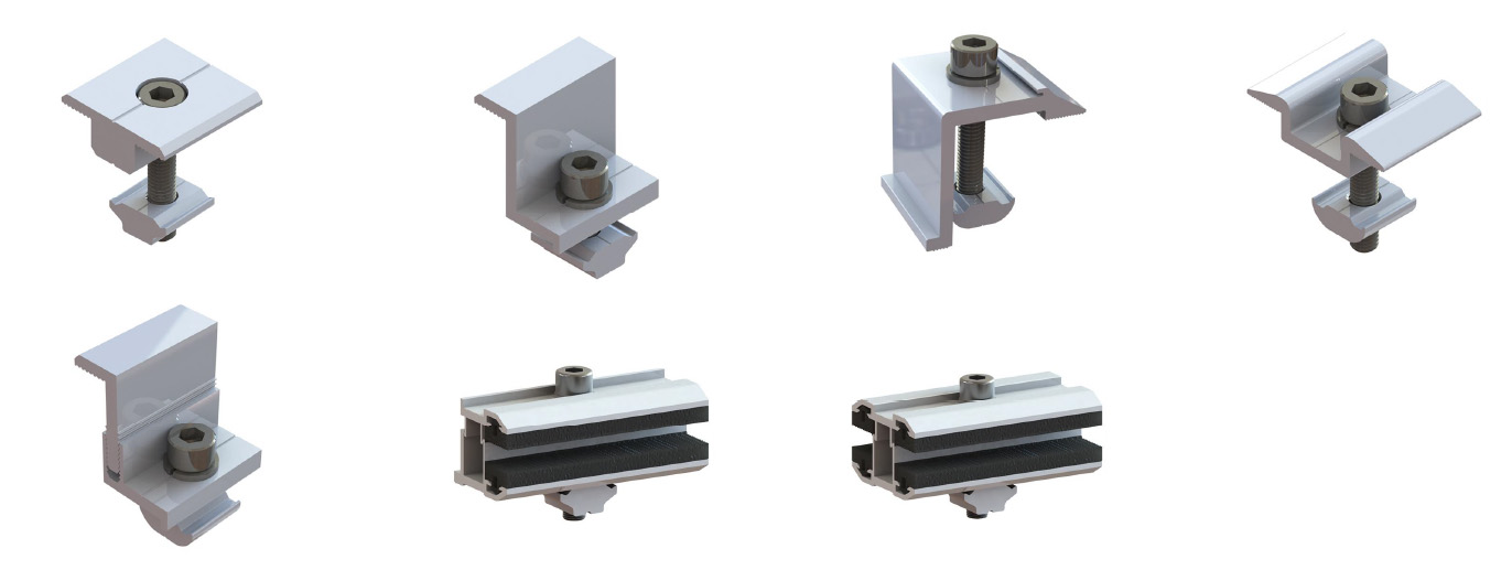 The clamps are available in multiple designs, including single or double bolt tightening options, streamlining installation and saving time. Compatible with both longitudinal and transverse panel layouts, they adapt to various metal roof profiles such as single or double rolled seams and work with most solar modules. Additional components like L-feet, fixed feet, or module clamps allow flexible and swift integration with full rail systems.