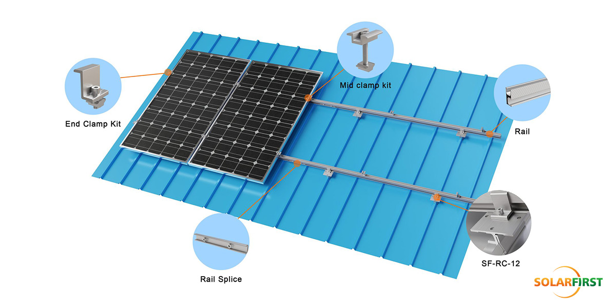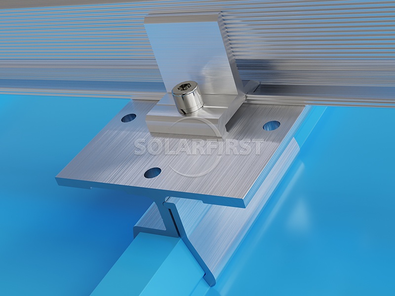 The system utilizes anodized aluminum clamps and rails, which impose a light load on the underlying roof structure. The specific design of the Klip Lok clamps varies to match different profiles of roofing sheets. For added versatility, the roof clamp can be combined with an L foot bracket to elevate the solar modules to a desired tilt angle.