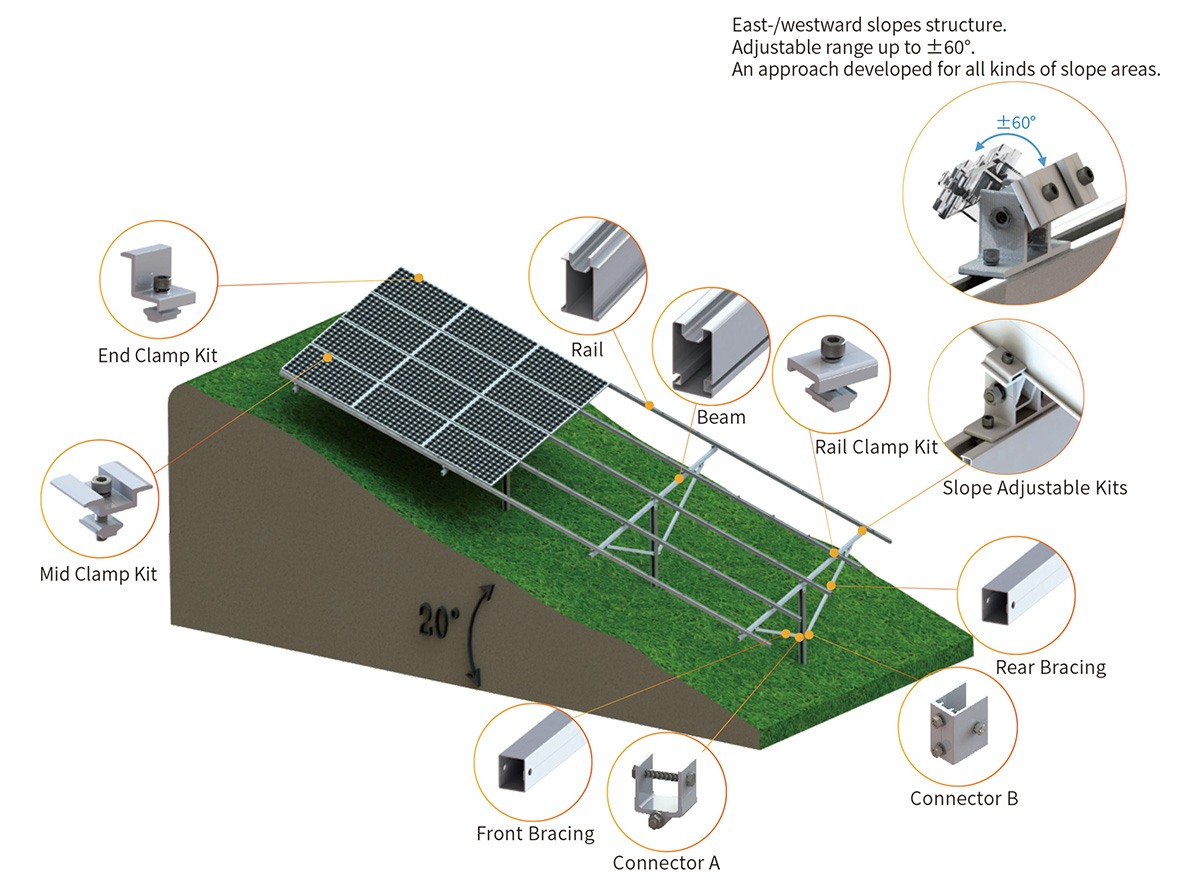 The pre-designed adjustable mounting points allow fine-tuning during installation, accommodating variations in terrain and module layout. This slope support solar system mount offers both structural flexibility and secure, reliable performance.