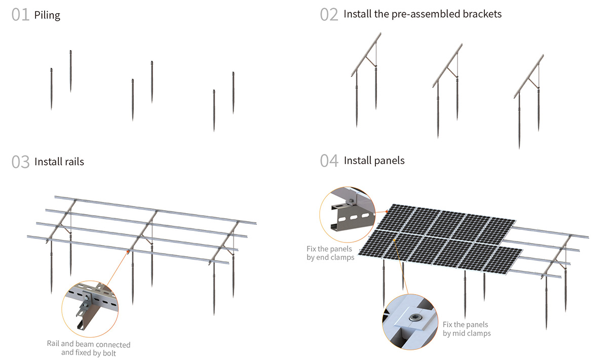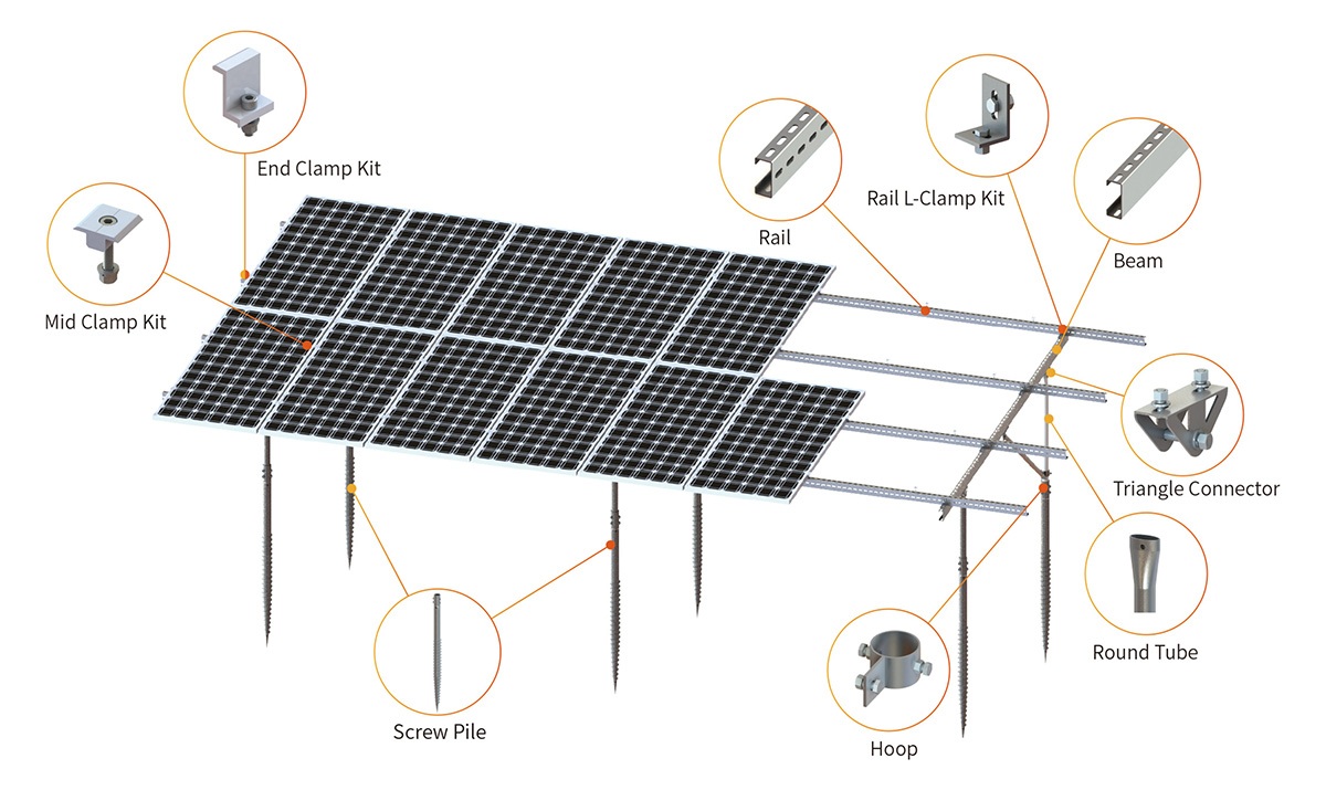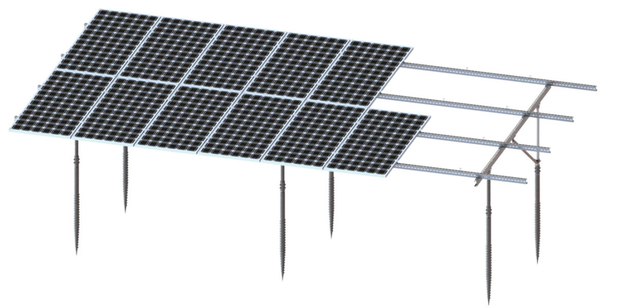The screw pile foundation system is installed deep into the ground for frost-resistant, solid structural support—offering superior stability over traditional concrete foundations. Compatible with both screw piles and concrete bases, this ground mounting structure for solar panels ensures reliable performance even under high wind loads up to 60m/s and snow loads of 1.4 kN/m².