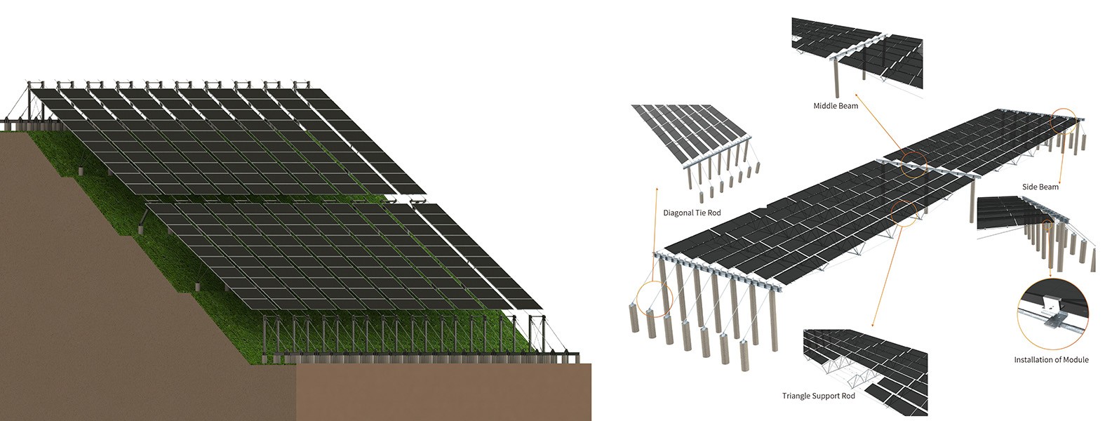 The double-layer cable flexible support system achieves a revolutionary span of ≤50 meters through a spatial cable net structure, creating an operation clearance of ≤6 meters. Compared with fixed supports, it reduces the amount of pile foundation usage by 55%, and is perfectly suitable for scenarios such as sewage treatment plants, agricultural photovoltaic complementarity, and fishery photovoltaic complementarity, and complies with the GB50017-2017 Steel Structure Design Code.